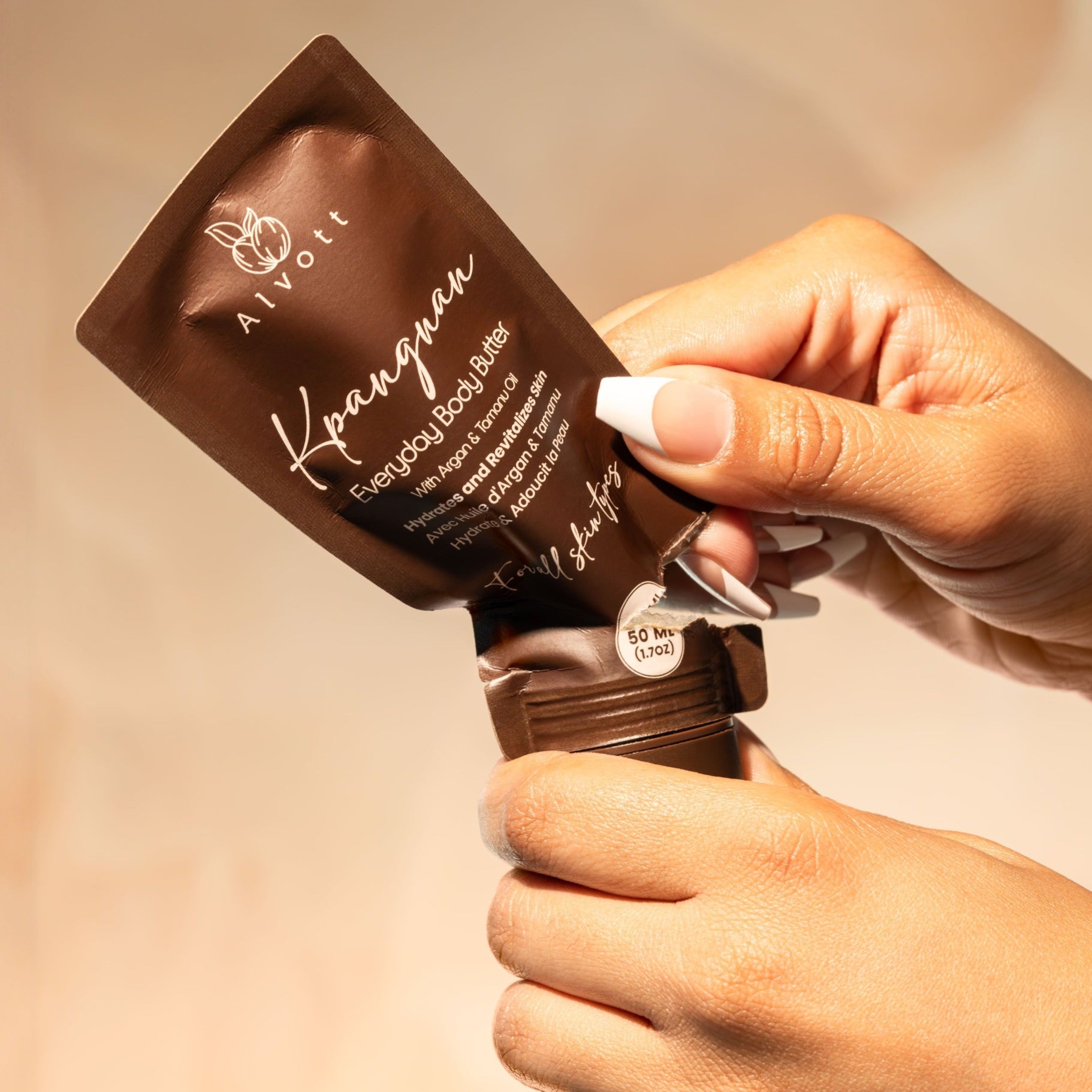 We’ve worked tirelessly to design packaging that truly embodies eco-friendly values. Our Kpangnan Body Butter and Peau De Verre Face Cream feature innovative kraft paper packaging—making us the first in the skincare space to use this groundbreaking technology. Additionally, our Black Soaps and Body Balms are packaged in sustainable sugarcane-based materials. With every product, you can feel good caring for your skin and the earth.